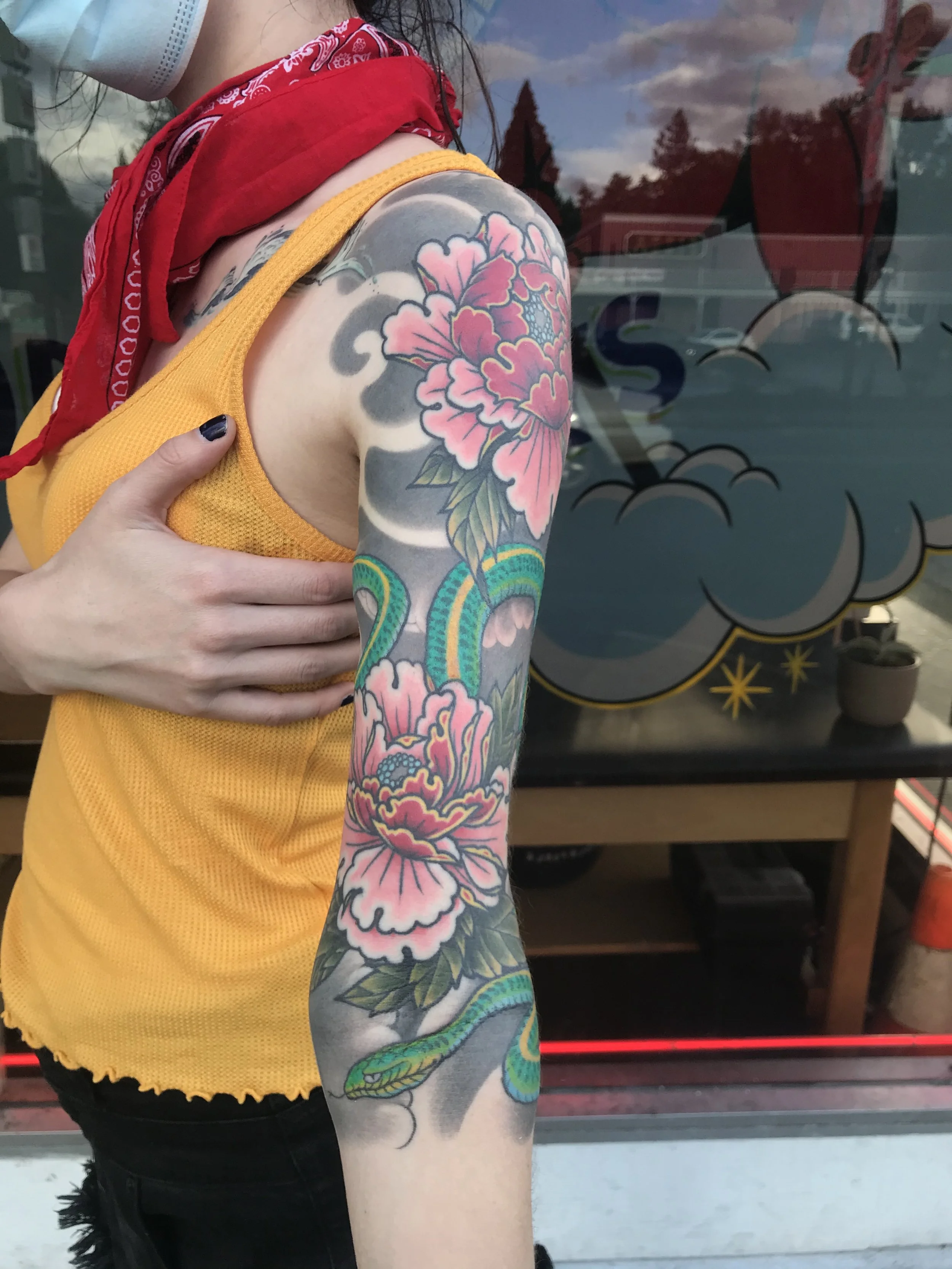Joel has been tattooing professionally since 1998. He had a traditional apprenticeship under Miya Bailey in Asheville NC, then worked for Bill Funk (the son of “crazy ” Philadelphia Eddie) in Philadelphia. After that he worked for Steve Anderson in Medford Oregon. He works in a wide variety of styles. Joel also carries on the traditions of old school tattooers by building needles and mixing pigments as well as building his own tattoo machines.